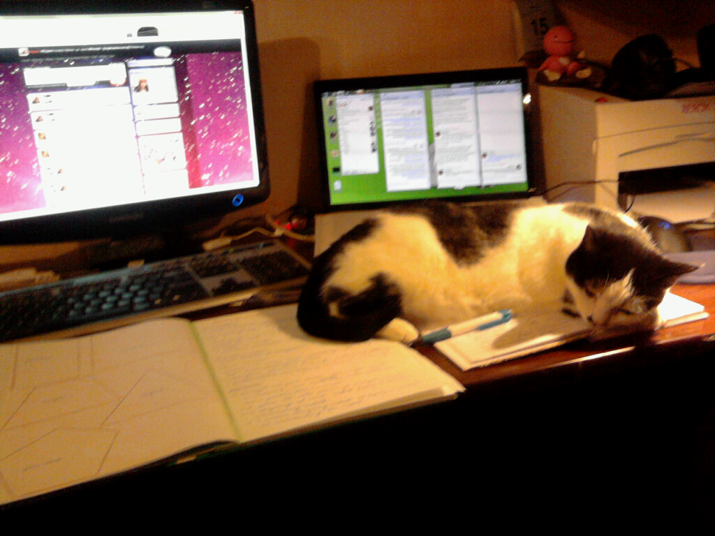 dotgosia: Jestem otoczona. #Pies leży albo za moim fotelem, albo obok pod ławą, a #kot.a nieopodal na oknie. Walka o moje względy trwa. |