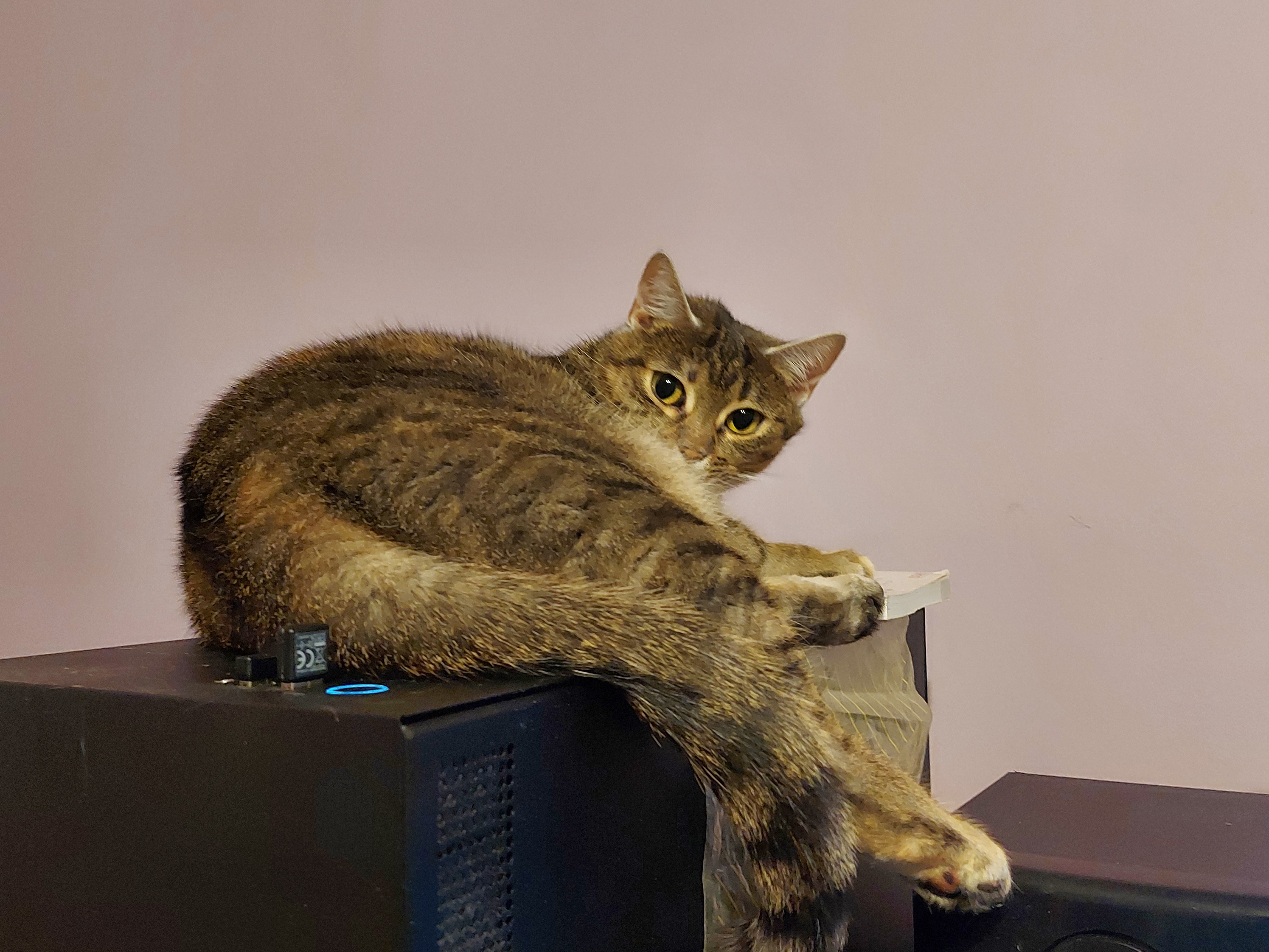 fik: [^fik] egzemplarz #1 siedzi w transporterze obrażony, egzemplarz #2 wyczyścił już podłogę pod szafkami w kuchni, a teraz chodzi po półkach z książkami |