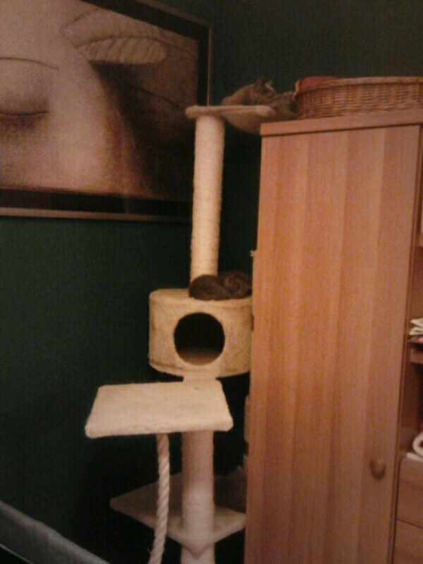 Ledwie nauczyły się wdrapywać na drapak, już kolejna przeprowadzka. Matka na górze, dwoje na budce, dwoje na dolnej półce. #pokakota