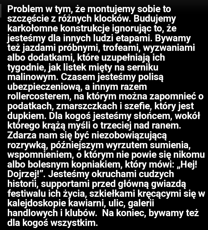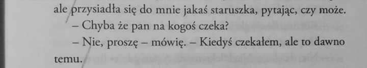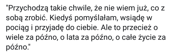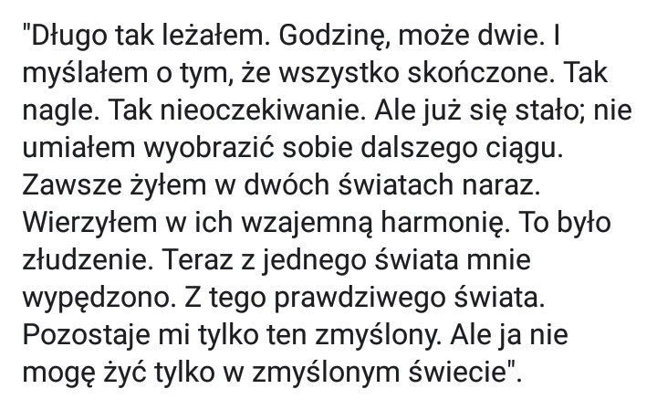 "Więc kiedy bywa się razem? – Nie wiem. Może wtedy, kiedy jest się samemu. I kiedy tego drugiego człowieka już nie ma, i kiedy wiesz, że nigdy już nie wróci do Ciebie. Może wtedy jesteś z nim naprawdę i na zawsze. Jeśli umiesz go pamiętać".