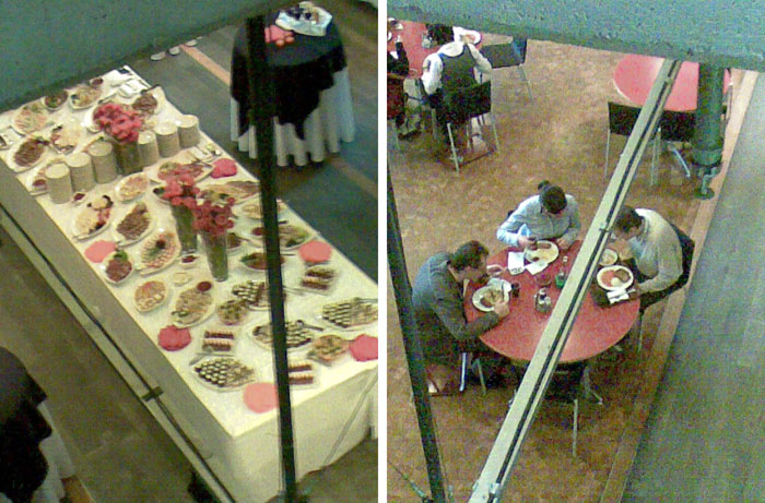 widok ze schodów w lewo i w prawo, konferencja dla gości vs. stołówka dla pracowników.