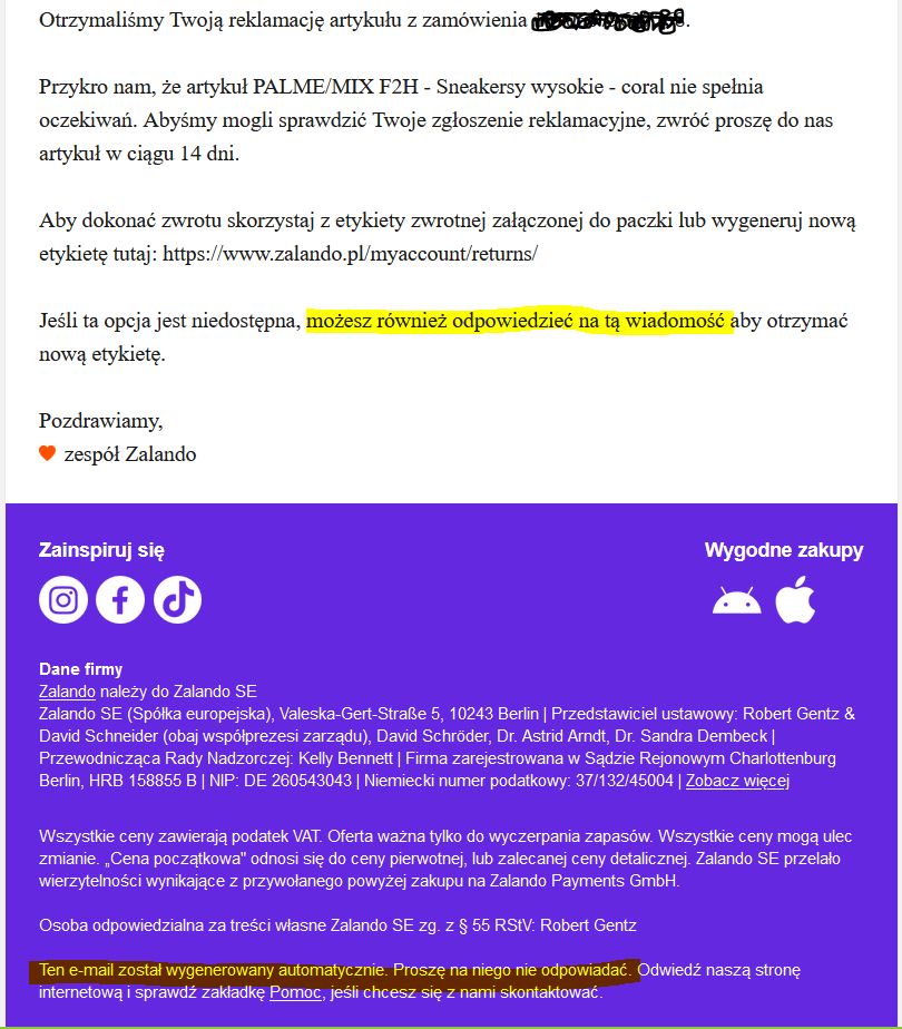 lafemmejuriste: [^lafemmejuriste] W ogóle sprawa dotyczy urwanego uchwytu od suwaka. Drobiazg, chociaż upierdliwy, ale pomyślałam, że przy takiej cenie buta jednak reklamację napiszę. Zalando żąda z tej okazji zwrotu butów. |