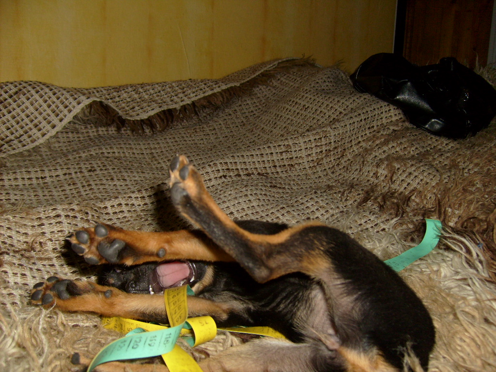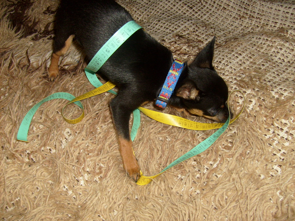 laff: mamy nową szafiarkę i modystkę w gronie... a może przyszłą krawcową? zobaczcie jak mój pies mierzy sobie talię :P |