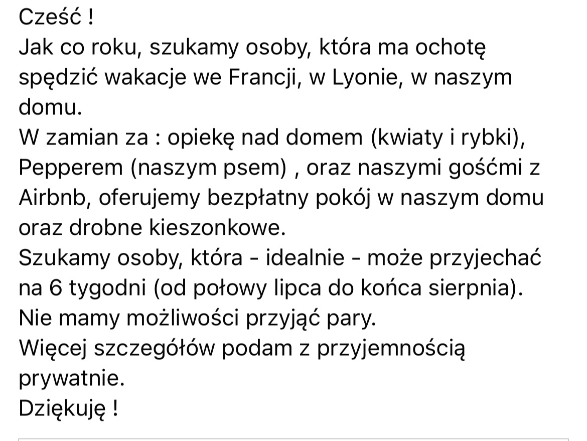 soupe: [^fel] ale za to musi się opiekować innymi gośćmi aibnb. Bo oni wyjeżdżają, na 5 czy 6 tyg, ale biznes musi się kręcić. |