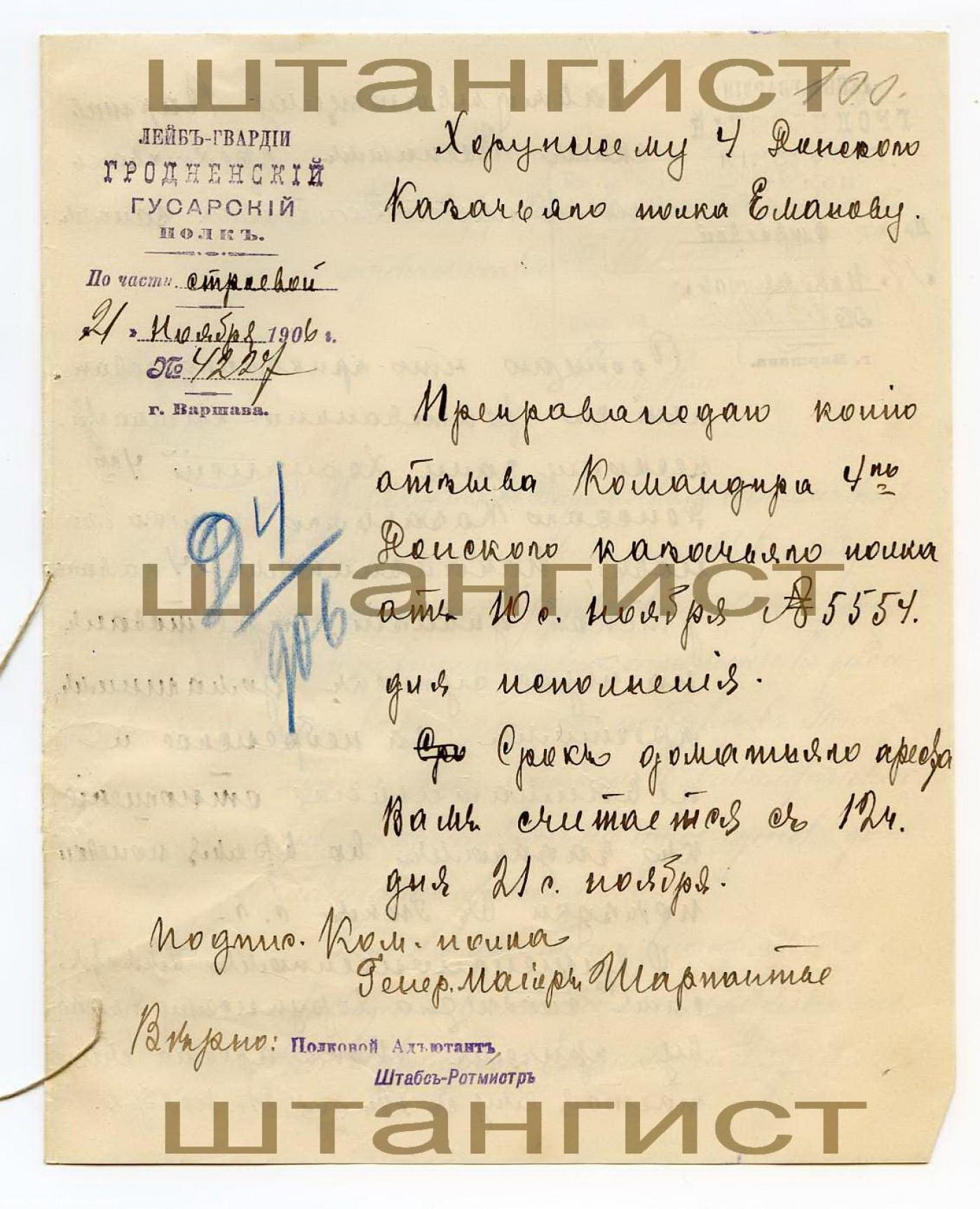Warszawa, Szczucin 1906. Korespondencja grodnieńskiego pułku huzarów z 4 pułkim kozaków dońskich w/s kozackiego chorążego ukaranego 3-dniowym- #retrofotorus