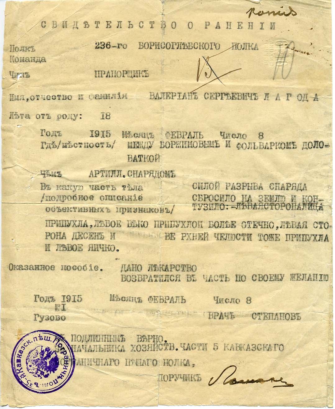 Guzów, 8 II 1915. Świadectwo ranienia chorążego Ładogi z 236 pp pod Borzymowem. Coś dla ^lavinka i ^meteor2017 #retrofotorus