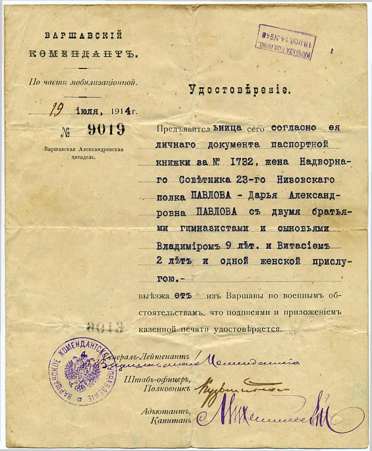 Warszawa 19 VII 1914. Dokument ewakuacyjny żony lekarza 23 nizowskiego pp z powodu "okoliczności wojennych" #retrofotorus