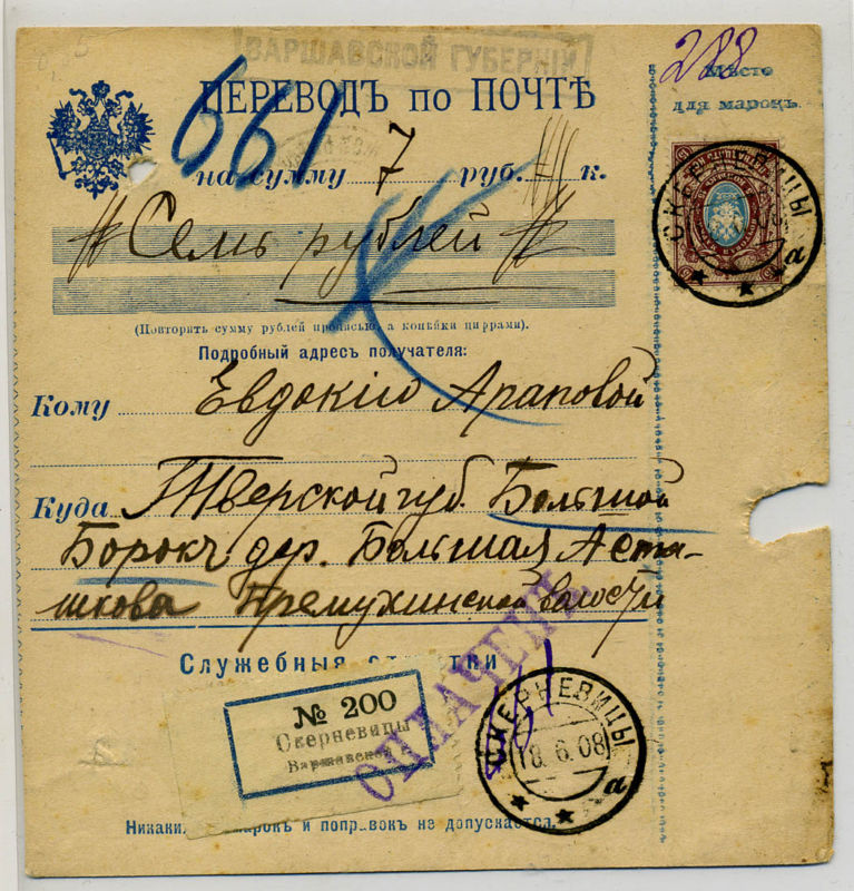 SKIERNIEWICE 1908. Przekaz pieniężny do guberni twerskiej [philately.foress.ru] #retrofotorus