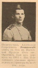 #bry Anatolij Giergijewicz Remiszewskij - od 12 VII 1914 podporucznik 8 estlandzkiego pp w Legionowie. Poległ 13 VIII 1914 pod Gross-Lauben (Lubian) w wieku 19 lat [forum.vgd.ru] #retrofotorus