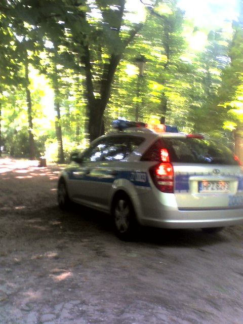 Policja spaceruje po parku. Suke wyprowadza.